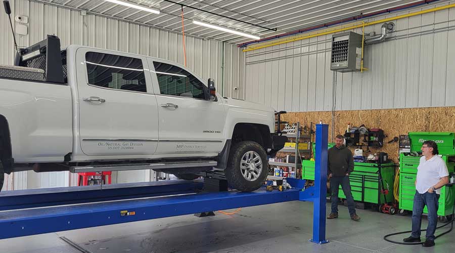 Our latest building is 50’ x 172’ and houses an office & break room as well as a 2-bay mechanic maintenance & repair area with an 18,000 lb. heavy duty lift for our fleet of 19 trucks, air compressors, skid steers, utility vehicles, forklift trucks and 12 combined cargo and flatbed trailers.