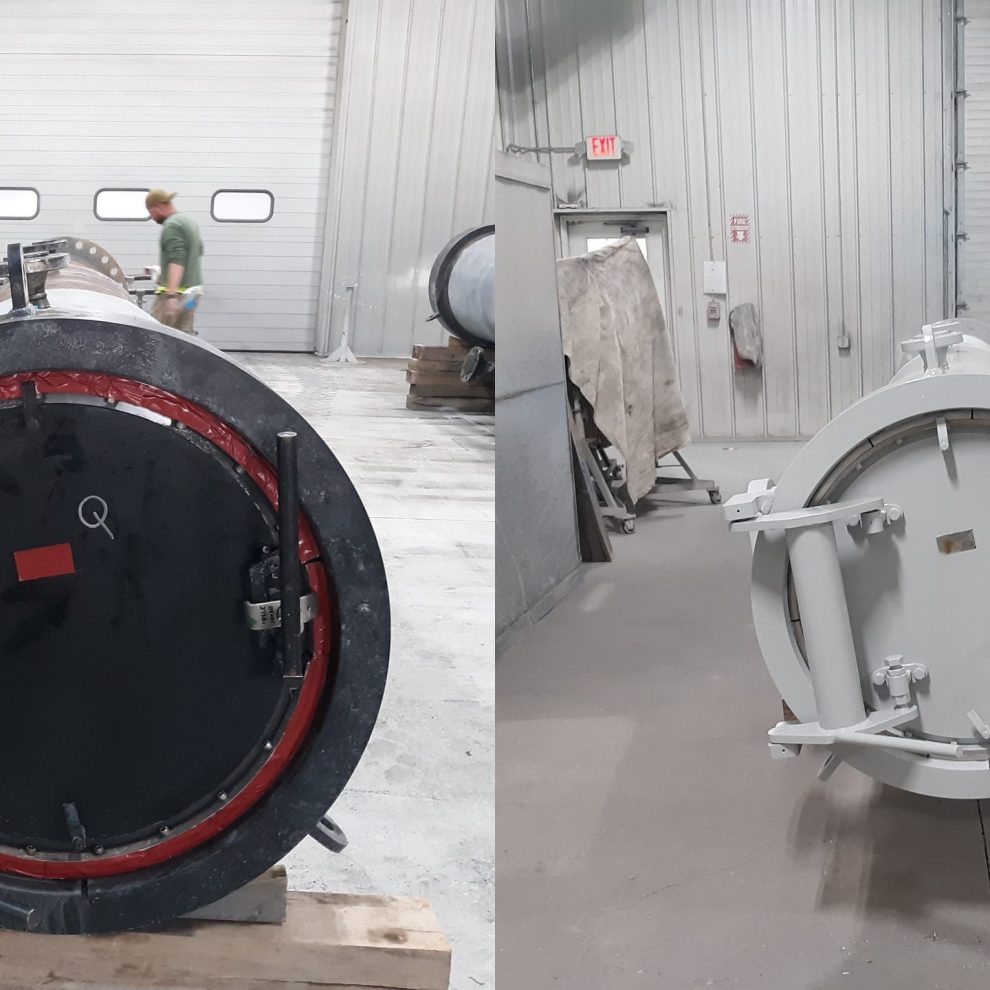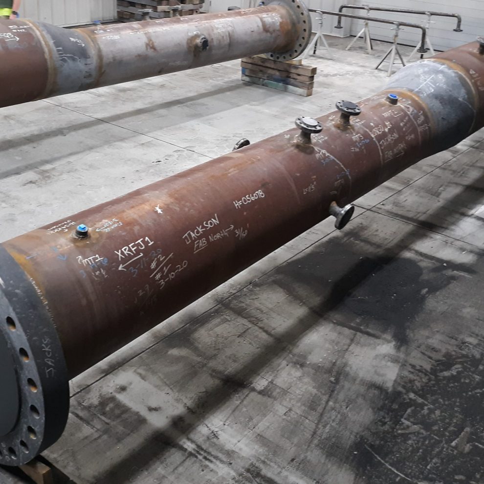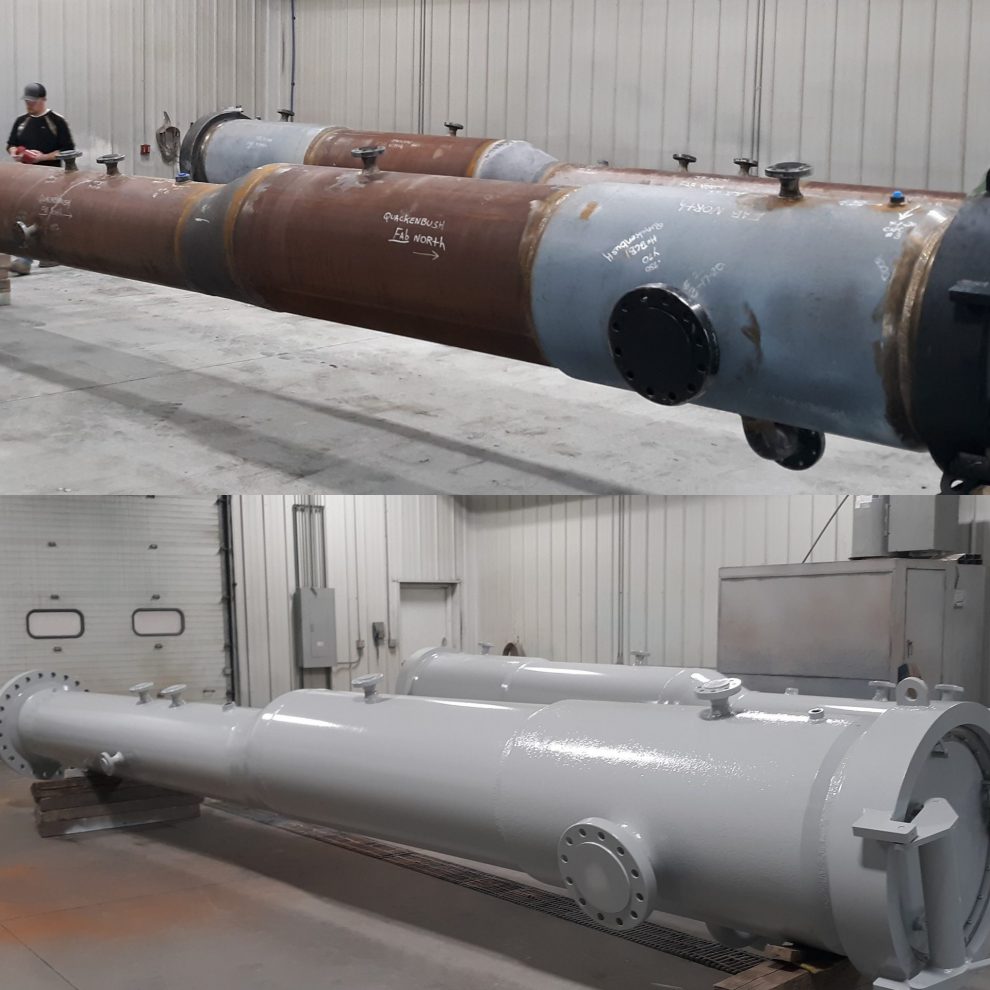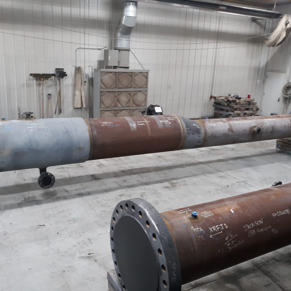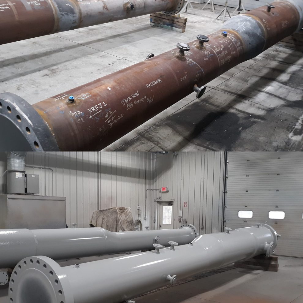 The pig launcher barrels are done and waiting to be shipped back to our customer. This was a nice in-shop sandblasting and coating project for our crews while we wait for some outside painting weather to appear! Great job by our crew to get these done ahead of schedule.