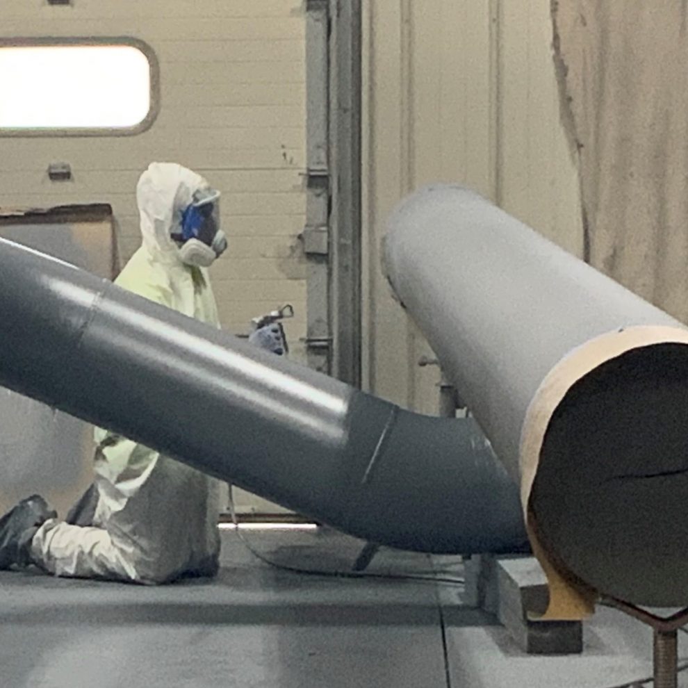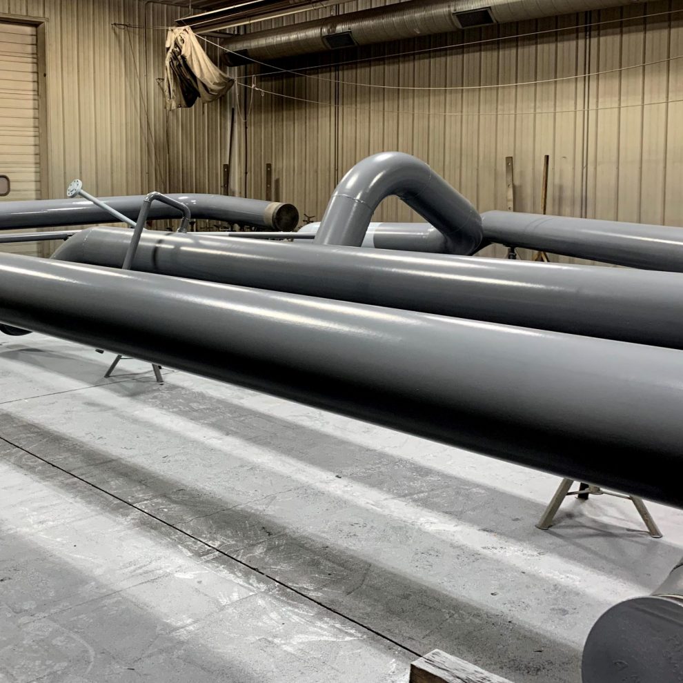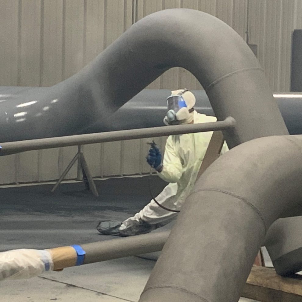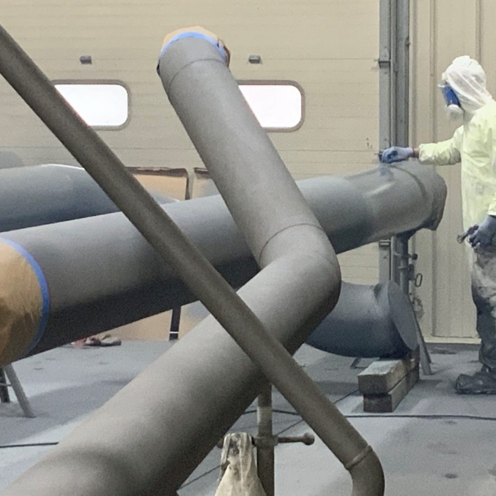 We had a couple of crews working on this project over the last couple of weeks, that included: Shane Kreamer, Eric Danowski, Cameron Miller, Alex Harenda and Ed Miller. They used one of our Plural Component Spray Rigs to apply the Heatflex Hi-temp coating.